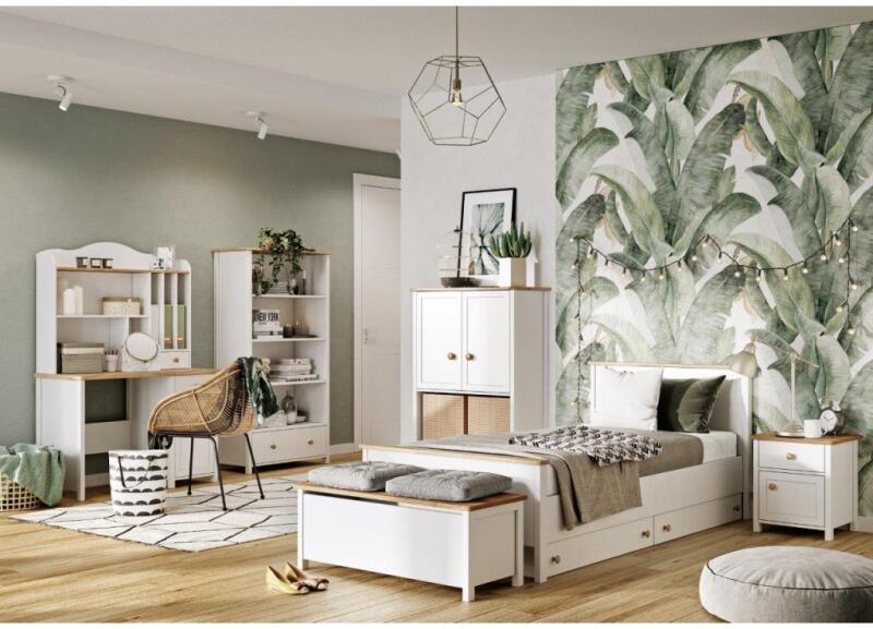 Gyerekszoba LORRY A LORRY szekcionált gyermekbútor mindenki számára ideális választás   romantikus hangulatot sugározni vágyó gyerekszobák . A LORRY szekcionált gyermekbútor készlet lágy színekben és formákban készül, így lányoknak és fiúknak egyaránt alkalmas. A gyermek szekcionált bútorok jellegzetessége az elegáns fehér matt színű dizájn, mely ízlésesen egészíti ki a világos - barna tölgy nash színt. Ezen kívül a LORRY gyerekszoba több egyedi elemből áll, melyek nagyon egyszerűen kombinálhatók, így teret adva a kreatív és variálható pozicionálásnak. test - laminált lap 16 mm fedőlap - laminált lemez 25 mm hátfal, fiókalj - HDF 3 mm markolat -   műanyag ABS élek A bútorok kiváló minőségű és erős laminált anyagból készülnek, vastagsága 16 mm, a barna színű felső lap 25 mm vastag. A laminált lap strapabíró ABS éllel készül. A bútor hátulja és a fiók alja tartós, 3 mm vastag HDF-ből készült. Tisztítása egyszerű, csak nedves ruhával vagy bútorokhoz tervezett termékkel törölje le. A