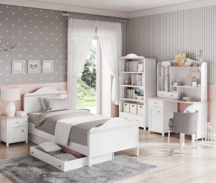 Gyermekszoba LUNYS 2 Az egyedi gyerekszoba LUNYS 2 (02,03, 04,07, 08) különösen a lányok kedvére fog tetszeni. A gyerekszoba fehér színnel és rózsaszínnel kombinálva készült, ami végső soron nagyon kellemes kontrasztot teremt. A gyerekszoba kiváló minőségű anyagokból készült, így ellenáll a víznek és a mechanikai sérüléseknek. A LUNYS kollekciót úgy tervezték, hogy a praktikum a gyönyörű és modern dizájnnal párosuljon. A gyerekszoba ára konnektort nem tartalmaz. Az ágyhoz tartozik egy fadeszkán lévő matrac, amely rácsként szolgál. Az ágyhoz rendelhetsz egy fiókot az ágy alá , 2 fiók használható egymás mellett. test - laminált lap 16 mm fedőlap - laminált lemez 18 mm hátfal, fiókalj - HDF 3 mm markolat -   műanyag ABS élek A bútorok kiváló minőségű és erős laminált anyagból készülnek, vastagsága 16 mm, a barna színű felső lap 18 mm vastag. A laminált lap strapabíró ABS éllel készül. A bútor hátulja és a fiók alja tartós, 3 mm vastag HDF-ből készült. Tisztítása egyszerű, csak nedves