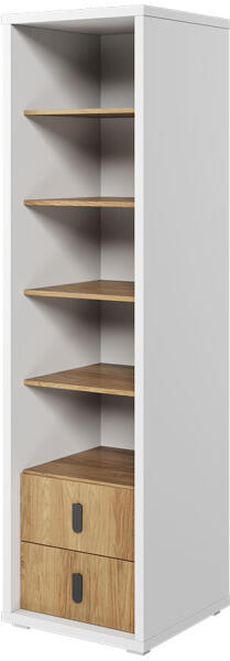 MISSI MS-03 polc A MISSI gyerekszoba bútorok tökéletesek tinédzserek és gyerekek számára, akik a divatos és univerzális mintákat kedvelik. A színkombináció univerzális - a fehér és a világos fa mindig remekül fog mutatni. Az univerzális stílusnak köszönhetően a MISSI bútorok alkalmasak egy színekkel teli szobába, de egy egyszerű dizájnú szobában is kiemelkednek. Az öt polcos MISSI MS-03 magas könyvespolc lehetővé teszi könyvek és kiegészítők hatékony bemutatását.   Alul két tágas és könnyen hozzáférhető fiók található alsóneműnek vagy iskolai felszereléseknek. A bútor stílusa érdekes módon ötvözi a modernitást egy csipetnyi hagyománnyal.   A fehér és a meleg fa szín időtlen kombinációja hangulatos kiegészítője lehet bármilyen enteriőrnek.   A divatos , masszív test, amely a polc vázát is meghatározza, magára vonzza a figyelmet.   A fiókok eleje a testszett alá került. laminált 16 mm / 32 mm 3 mm-es HDF ABS élek fém fogantyúk A bútor kiváló minőségű és tömör laminált lapból készült, 16