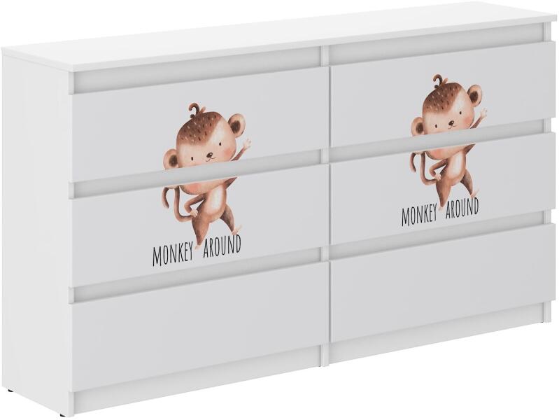 Majom mintás ifjúsági komód - Tárolás stílusosan! ? Dobd fel a gyerekszobát ezzel a vidám és praktikus komóddal, melynek majom mintája garantáltan mosolyt csal az arcokra! A 6 tágas fióknak köszönhetően minden játék, ruha és kincs könnyedén elfér. Főbb jellemzők:Anyaga: Minőségi laminált LMDF és MDF Színe: Fehér, mely könnyen illeszkedik bármilyen szobába Minta: Tartós, élénk színű majom minta, speciális laminálással védve a kopástól Fiókok: 6 darab, gördülékeny mozgású görgős sínekkel Méretek:Lemez vastagsága: 16 mm Mélysége: 30 cm Szélessége: 140 cm Magassága: 76 cm Ez a komód nem csak szép, hanem praktikus is, segít rendszerezni a gyerekszobát, miközben egyedi stílust kölcsönöz neki. A tartós anyagoknak köszönhetően hosszú éveken át szolgálja majd a családot.