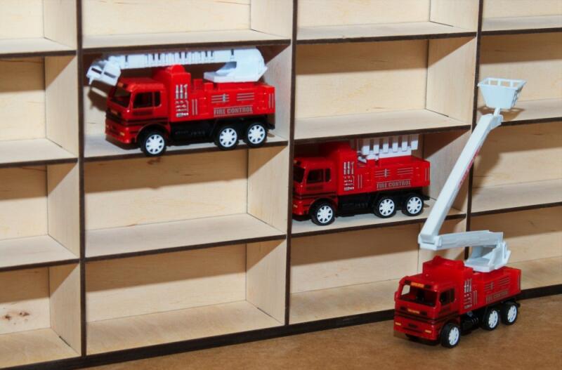 A polc fakkjai magassága 6cm, szélessége 14cm és mélysége 6cm, így kényelmesen elférnek rajta az autók, de nem öntik ki a polcot. A